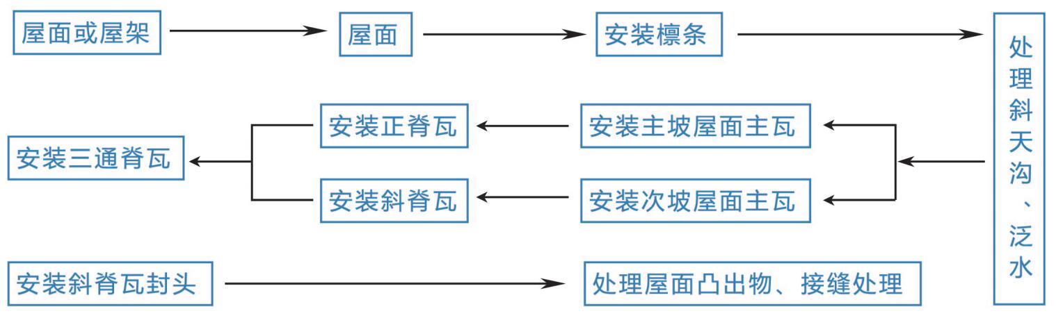 正、斜脊瓦安裝搭接處應鋸齊,正,斜脊瓦安裝完畢后再安裝三通瓦。